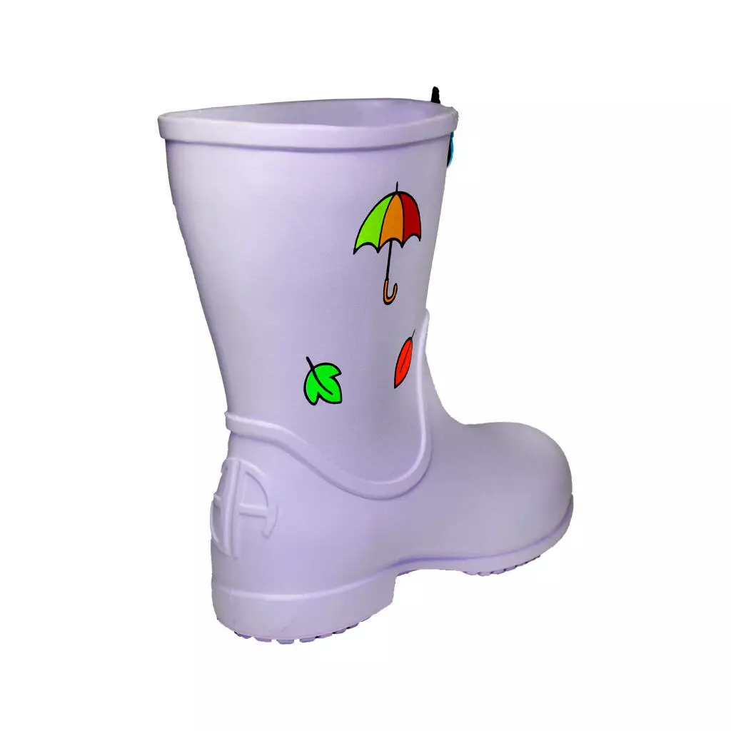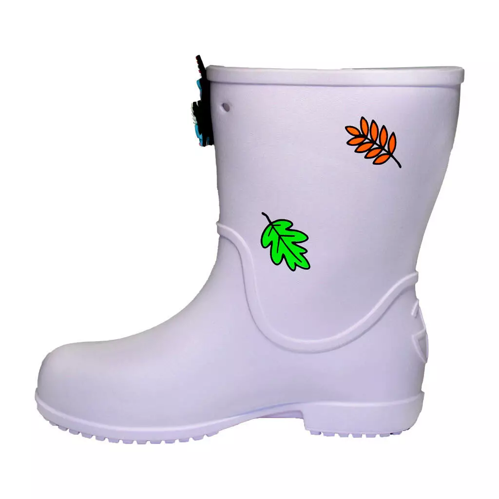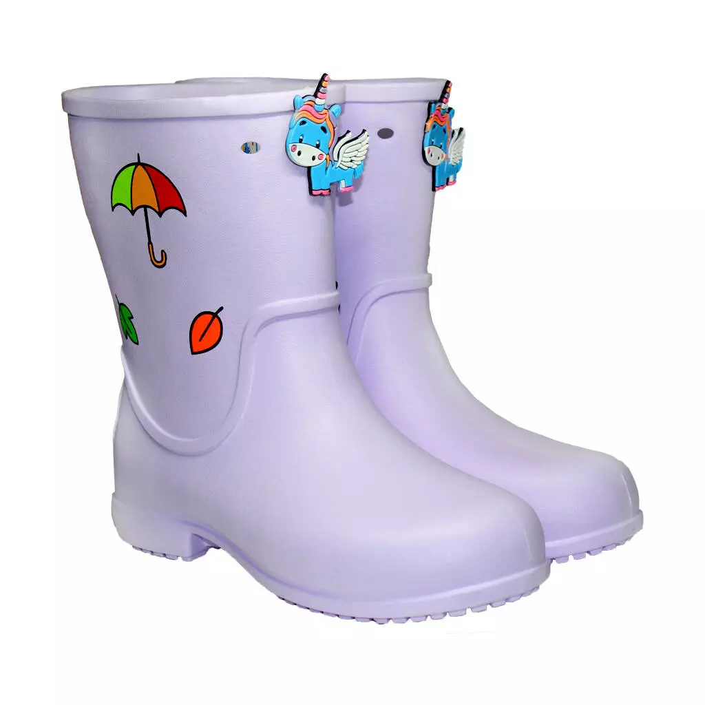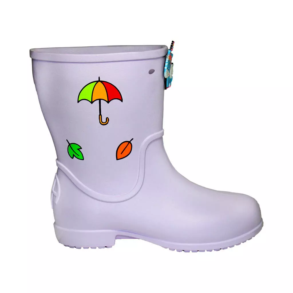 Особливість цієї моделі — різнокольорові наліпки із парасольками та листочками, які роблять взуття ще яскравішим і привабливішим для дітей. Такі чобітки не лише практичні, а й стильні.