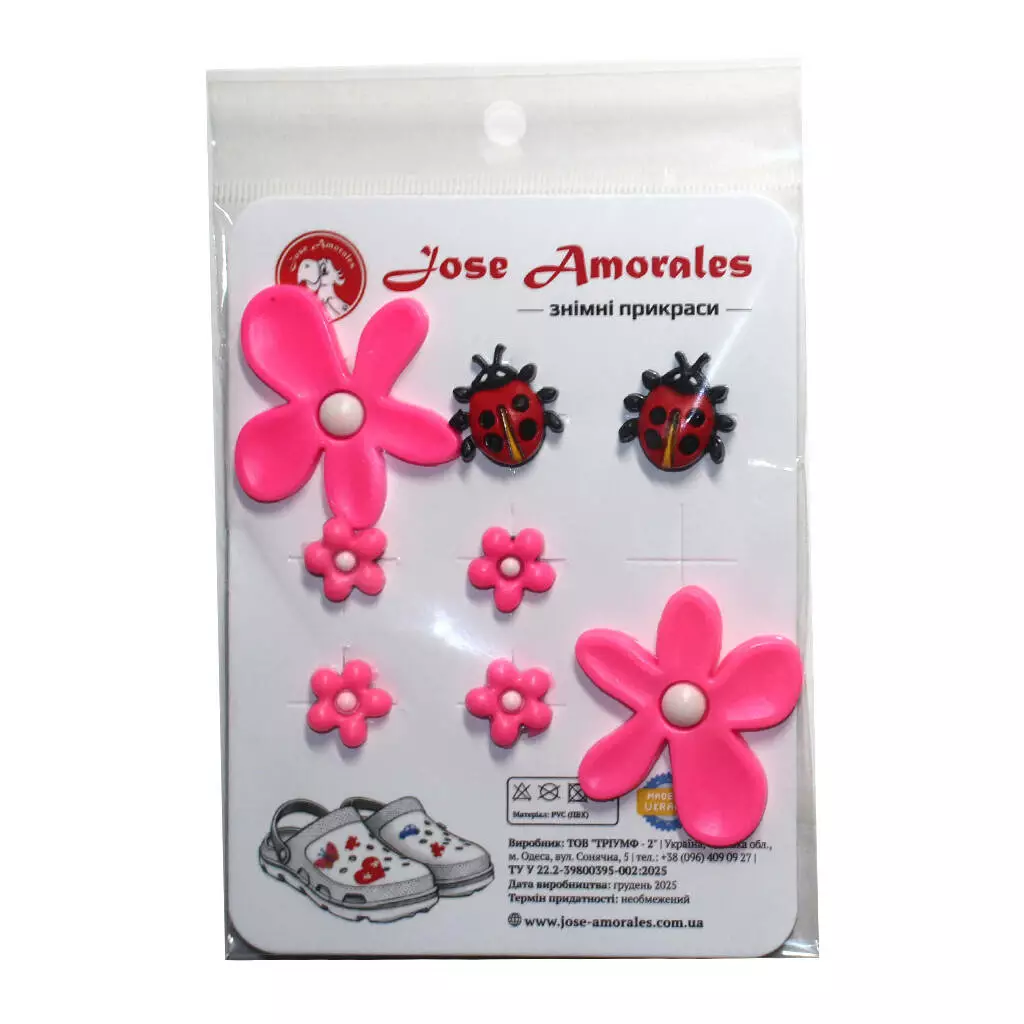 Прикраси легко кріпляться до сабо та іншого взуття або аксесуарів з отворами, надійно фіксуються та міцно тримаються.