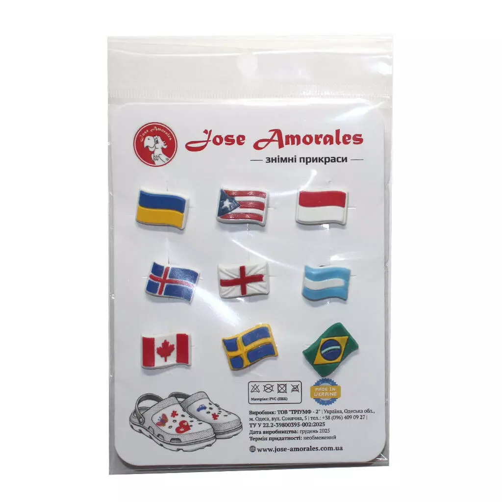 Прикраси легко кріпляться до сабо та іншого взуття чи аксесуарів з отворами, надійно фіксуються, матеріал стійкий до води, бруду, сонячних променів.